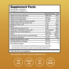 THÀNH PHẦN: Vitamin A, Vitamin C, Vitamin D3, Vitamin B1, Vitamin B2, Niacin, Vitamin B6, Folate, Vitamin B12, Biotin, Pantothenic Acid, Vitamin E, Zinc, MSM, Collagen Hydrolysate, Prime Beard Complex (Coconut Oil, Pumpkin, Saw Palmetto, Ceylon Cinnamon, Nettle. Other Ingredients: Vegetable Cellulose Capsule.